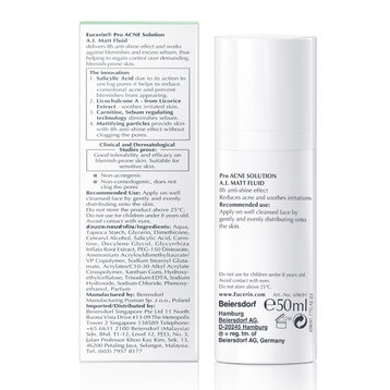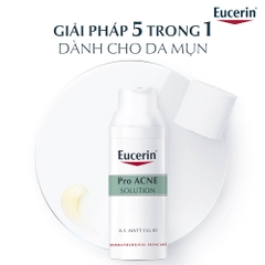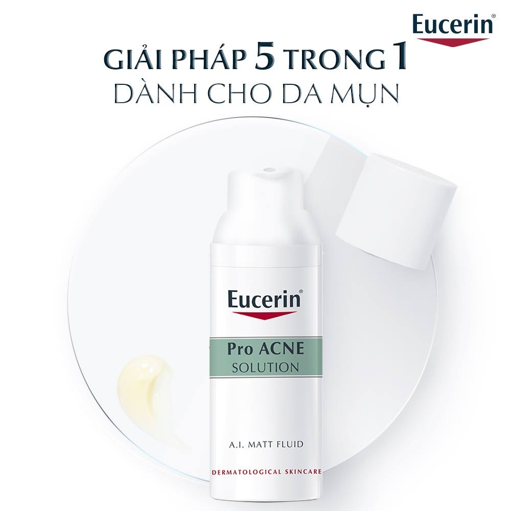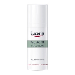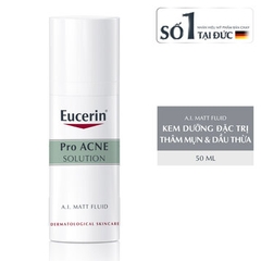 Kem Dưỡng Kiểm Soát Nhờn & Giảm Mụn Eucerin ProAcne A.I Matt Fluid đến từ thương hiệu dược mỹ phẩm Eucerin của Đức là kem dưỡng được thiết kế dành cho làn da dầu, mụn và nhạy cảm, với công thức đã được nghiên cứu và chứng minh lâm sàng giúp giảm đồng thời 5 vấn đề về mụn: Mụn, dầu thừa, vi khuẩn mụn, thâm mụn và lỗ chân lông to. Đồng thời, sản phẩm giúp duy trì làn da khô thoáng, không bóng nhờn trong suốt 8 giờ, không gây bít tắc lỗ chân lông.